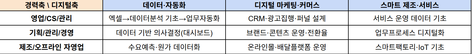 아래 표에서 **본인 경력축(가로)**과 **보완하고 싶은 디지털축(세로)**을 교차해, 딱 1칸을 먼저 고릅니다. “전부 배우기”가 아니라 한 칸 완성 → 인접 칸 확장이 중장년 최적화 전략.